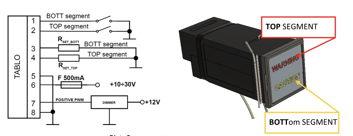 Das Tablo-Gerät ist ein Produkt zur optischen Signalisierung des Status von bis zu zwei Geräten, die mit einem Anzeigeausgang ausgestattet sind. Dank der vom Benutzer einstellbaren Farbe (rot, grün, orange) kann das Gerät einen Fehler, eine Warnung oder einen normalen Betriebszustand signalisieren. Dies kann mit einem Standardtext oder einem individuellen transparenten Text signalisiert werden. Das Produkt unterstützt die Einstellung der Ausgangshelligkeit über einen Dimmeingang.