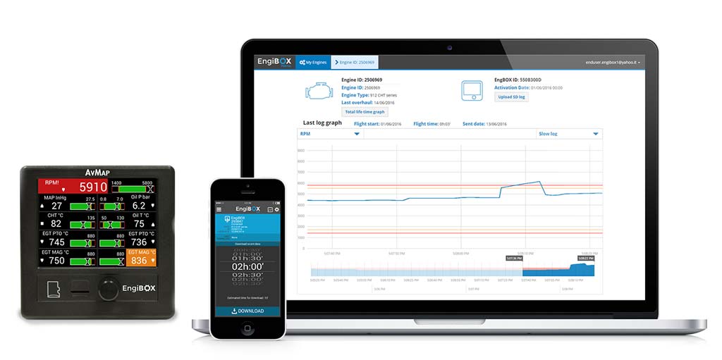 AvMap EngiBOX ist ein leichter (nur 250 g) und kompakter Motormonitor, der die wichtigsten Motorparameter anzeigt: